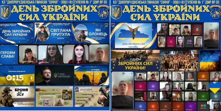 День Збройних Сил України у КЗ "Дніпрорудненська гімназія "Софія" - ЗОШ І-ІІІ ступенів № 1" ДМР ВР ЗО Сьогодні наша гімназія провела зворушливий і надзвичайно важливий онлайн-захід, присвячений Дню Збройних Сил України — дню сили, мужності та нескореності. З вітальним словом до учасників звернулася директорка Світлана Притула. Вона наголосила, що українські воїни — це щит і гордість…