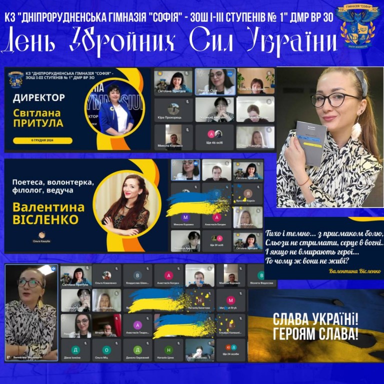 День Збройних Сил України у КЗ "Дніпрорудненська гімназія "Софія" - ЗОШ І-ІІІ ступенів № 1" ДМР ВР ЗО Сьогодні в нашому закладі освіти відбулася надзвичайно тепла і натхненна зустріч з талановитою запорізькою поетесою, волонтеркою та справжньою патріоткою Валентиною Вісленко. Ця подія була приурочена до Дня Збройних Сил України та свята Святого Миколая. У ході зустрічі ми слухали проникливі вірші…