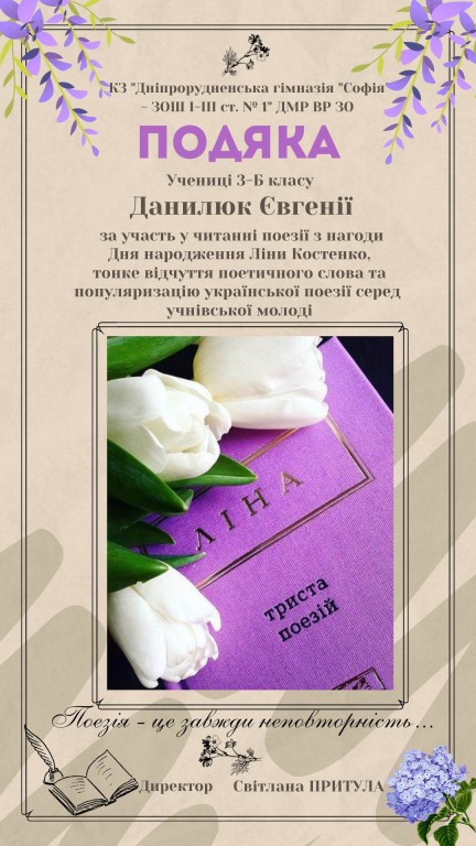 Виноситься ПОДЯКА читачам поезії Ліни Костенко з нагоди Дня народження поетеси, за тонке відчуття поетичного слова, художню виразність та популяризацію української поезії серед учнівської молоді. Дякуємо вчителям та батькам, які залучили дітей! Наближаємо перемогу разом! …