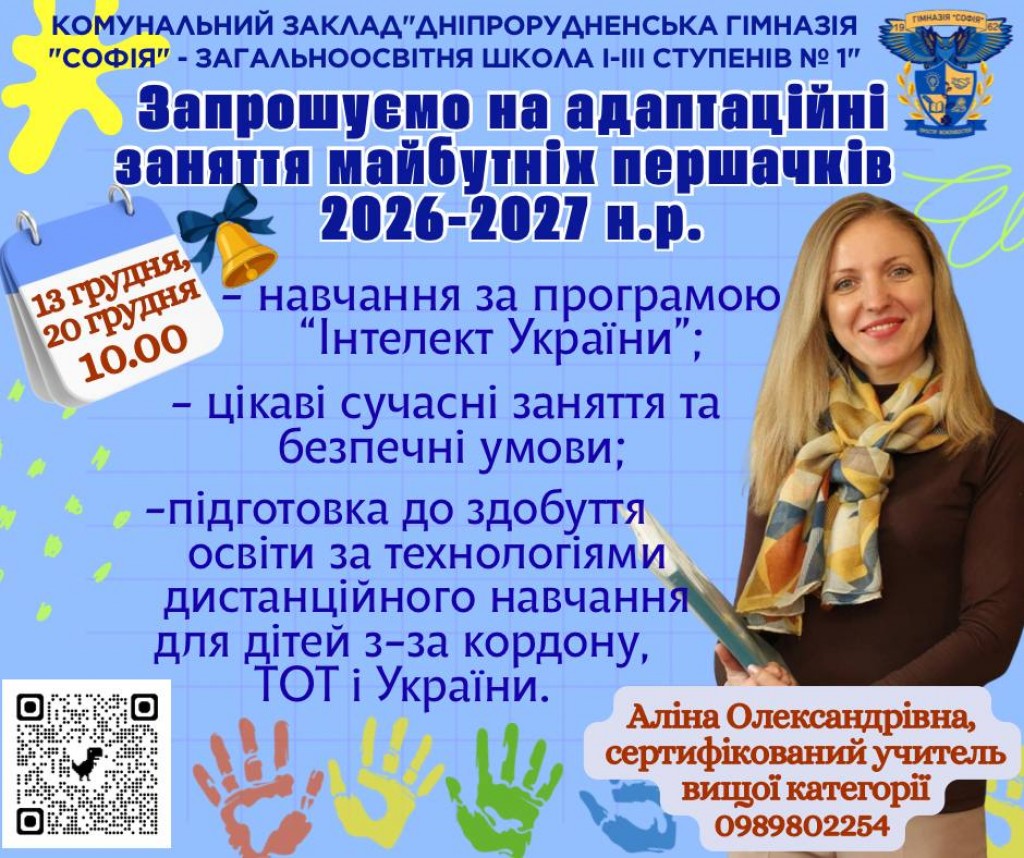 Раді повідомити, що починаємо набір до 1-го класу 2026-2027 н.р.13 та 20 грудня 2025 року наш заклад освіти чекає майбутніх першачків на адаптаційно-розвивальні заняття за технологіями дистанційного навчання