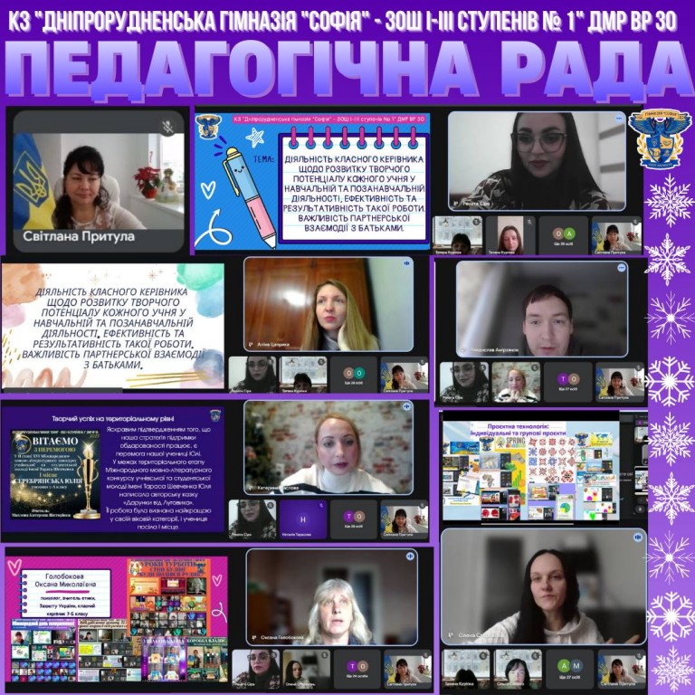 Різдвяно-новорічна зустріч для учнів початкової школи КЗ "Дніпрорудненська гімназія "Софія" - ЗОШ І-ІІІ ступенів № 1" ДМР ВР ЗОНапередодні світлих різдвяних свят для учнів початкової школи нашої гімназії відбулася тепла онлайн-зустріч, сповнена щирих емоцій, радості та святкового настрою З вітальним словом до дітей звернулася директор гімназії Світлана ПРИТУЛА, яка привітала учнів із Різдвом…