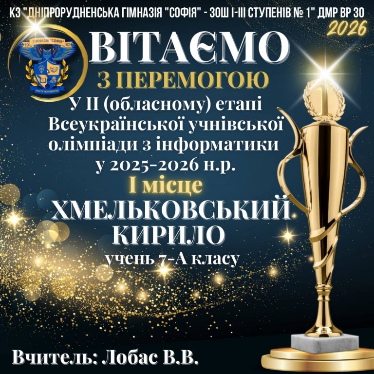 З гордістю повідомляємо про надзвичайне досягнення нашого учня! ХМЕЛЬКОВСЬКИЙ КИРИЛО, учень 7-А класу, здобув І МІСЦЕ у ІІ (обласному) етапі Всеукраїнської учнівської олімпіади з інформатики! Це — результат наполегливої праці, глибоких знань, логічного мислення та справжнього таланту. Кирило гідно представив наш заклад освіти на обласному рівні, довівши, що наполегливість і прагнення до…