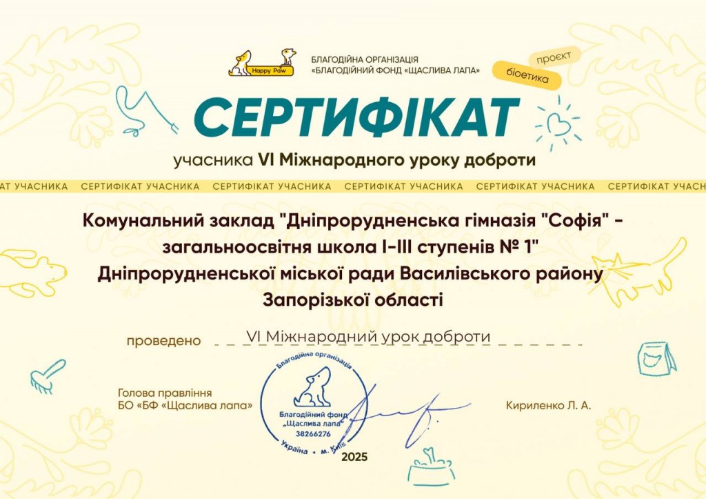 Доброта починається з нас! Учні та вчителі КЗ «Дніпрорудненська гімназія “Софія” – ЗОШ І–ІІІ ступенів № 1» із щирими серцями долучилися до VI Міжнародного уроку доброти, організованого благодійним фондом «Щаслива лапа» Цей урок — не просто про любов до тварин. Це про щирість, співчуття, турботу й уміння бачити світ очима добра Діти з натхненням…
