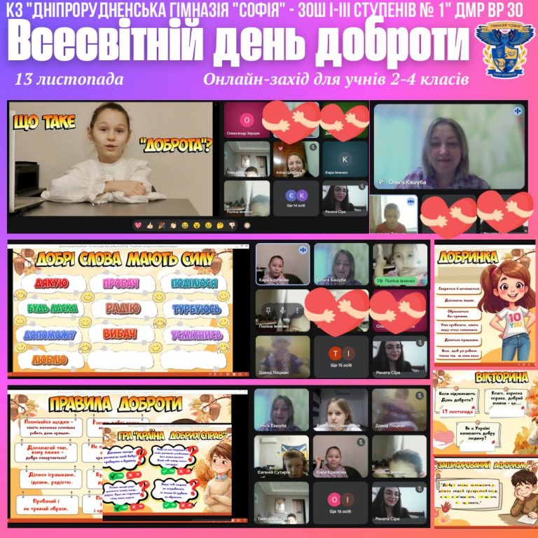 Всесвітній день доброти у КЗ «Дніпрорудненська гімназія “Софія” – ЗОШ І–ІІІ ступенів № 1»13 листопада у нашому закладі освіти відбувся онлайн-захід для учнів 2–4 класів, присвячений Всесвітньому дню доброти.Соціальний педагог Ольга Володимирівна Кашуба провела цікаву та змістовну зустріч, під час якої діти дізналися, що таке доброта, як важливо щодня…