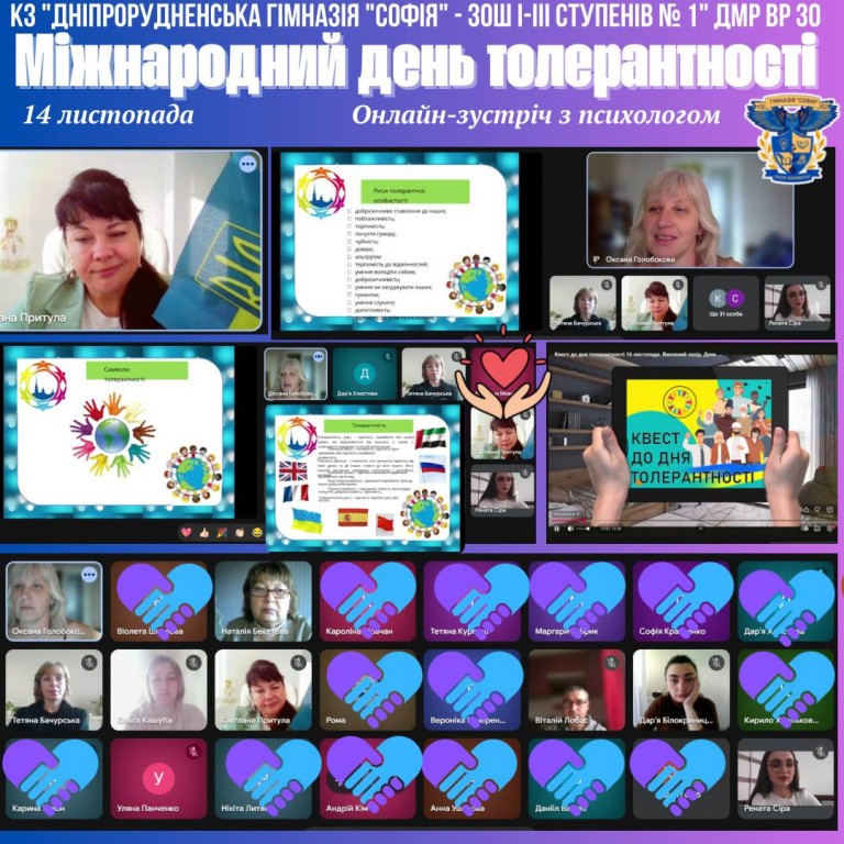 Міжнародний день толерантності у нашому закладі освіти 14 листопада учні 7–11 класів КЗ «Дніпрорудненська гімназія “Софія” – ЗОШ І–ІІІ ступенів №1» долучилися до пізнавальної онлайн-зустрічі з практичним психологом Оксаною Голобоковою, присвяченої Міжнародному дню толерантності. З теплими словами до школярів звернулася директор закладу Світлана Притула.…